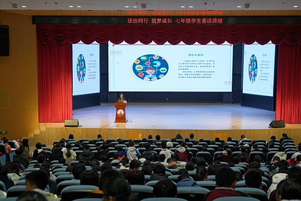 为持续深化青少年法治宣传教育,筑牢校园安全防线,近日,我院党组成员、副院长杨清走进鼎湖区第一实验学校,开展以“知法懂法守法,守护我们的身心健康”为主题的普法课,在同学们心中播撒下遵纪守法、明辨是非的种子。该校七年级全体师生600余人参加本次活动。 课堂伊始,“典”亮生活 “高空抛物的责任谁来负?”“踢球时误伤了同学怎么办?”“网络打赏能否追回?”…… 杨清副院长从与同学们息息相关的《民法典》切入,引导大家思考生活小事背后隐藏的法律道理,让同学们在无形中对法律的定义、内涵有了更深刻的认知,充分认识到学习法律的重要意义。 随后,杨清副院长结合趣味普法动画视频,将《未成年人保护法》中家庭保护、学校保护、司法保护等核心内容用通俗易懂的语言展开重点解读,把抽象的法律知识转化为看得见、听得懂、记得住的身边案例。